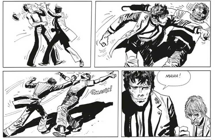 - L’absence de gris intermédiaires : pratt travaille souvent sans hachures sophistiquées. Les planches de corto maltese sont structurées par de grands aplats de noir profond qui contrastent directement avec le blanc du papier, une technique qui crée un effet dramatique et cinématographique.