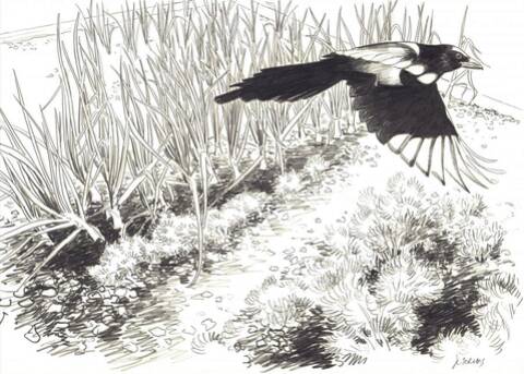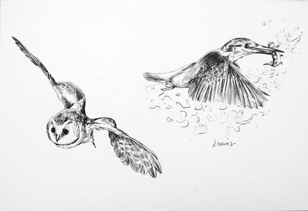 - L’encre de chine : le cœur de son œuvre réside dans le travail au pinceau et à la plume, créant des lignes nettes et des aplats d’encre noire très dense.