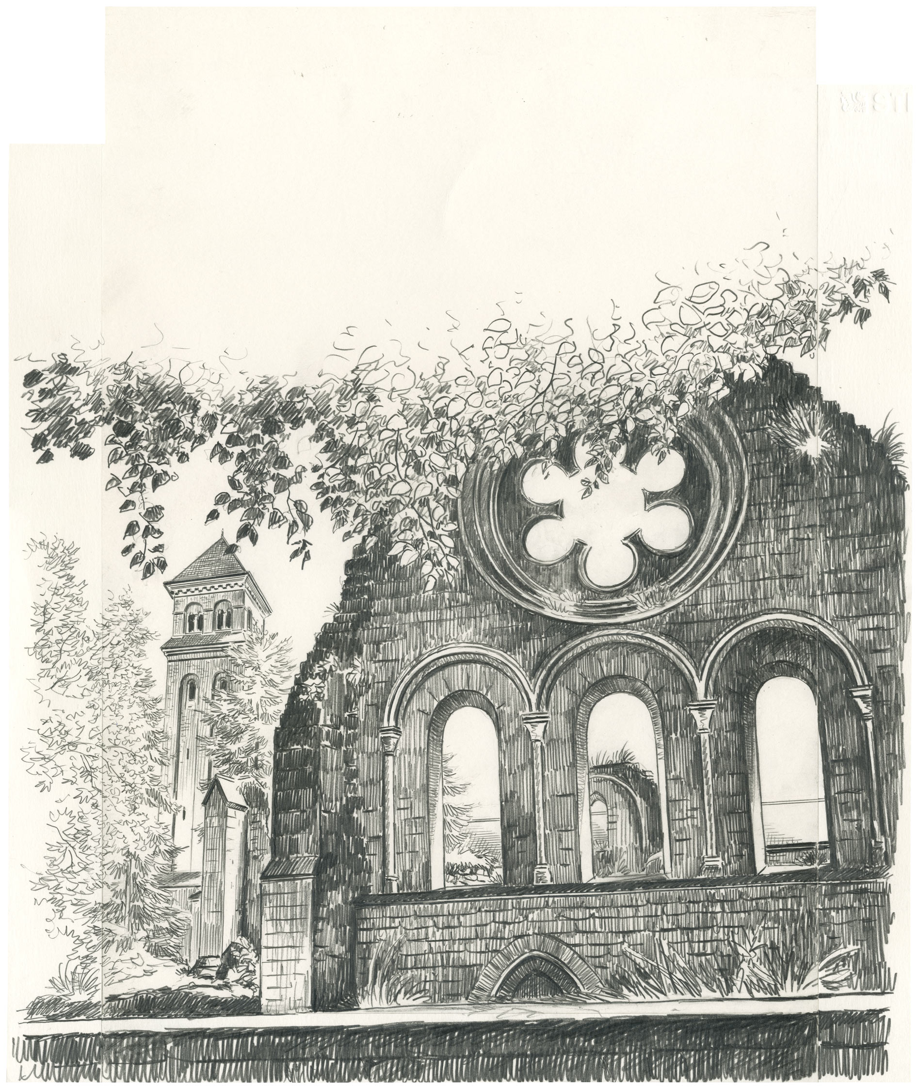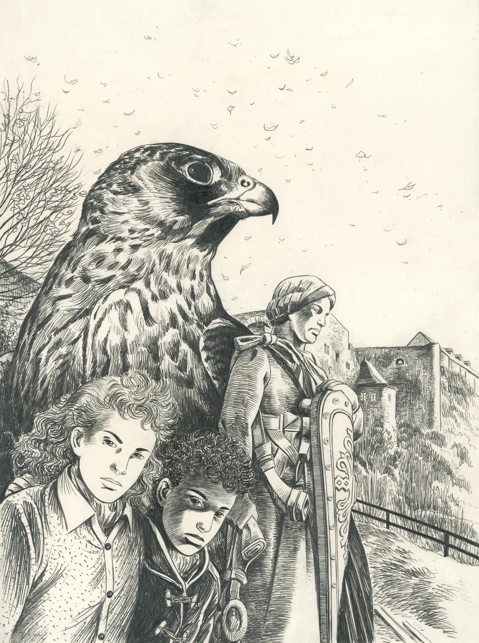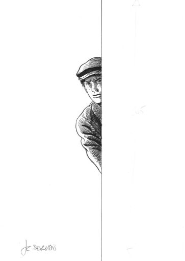 - Les hachures et tracés croisés : pour créer les ombres, les textures de l’écorce, les nuages ou les reliefs des visages, Servais utilise la technique du hachurage. La densité et le croisement des lignes remplacent les niveaux de gris et créent un contraste dynamique essentiel à son dessin.