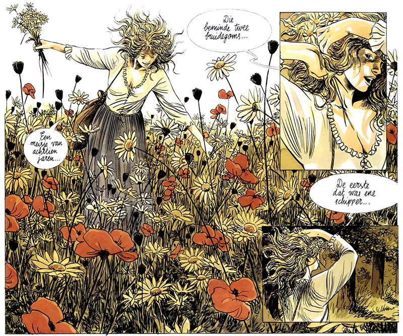 Les récits de Servais sont souvent des chroniques paysannes et des contes fantastiques ancrés dans le terroir de la gaume et de l’ardenne (l’almanach, les chemins de compostelle). Son dessin sert cette narration intemporelle : l’atmosphère boisée, les vieux murs et les figures mythiques sont construits par le jeu d’ombres et de lumières.